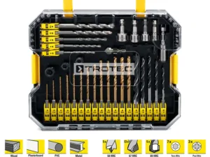 El juego multiuso de brocas y puntas de atornillado, de 49 piezas, es el complemento profesional para todos los taladros y destornilladores con portabrocas hexagonal comerciales. Quien trabaje con frecuencia en diferentes tajos cambiando entre diferentes materiales como el metal, el hormigón, la mampostería o la madera, por ejemplo, ya no querrá prescindir de la variedad de brocas, puntas y vasos de metal duro resistente.